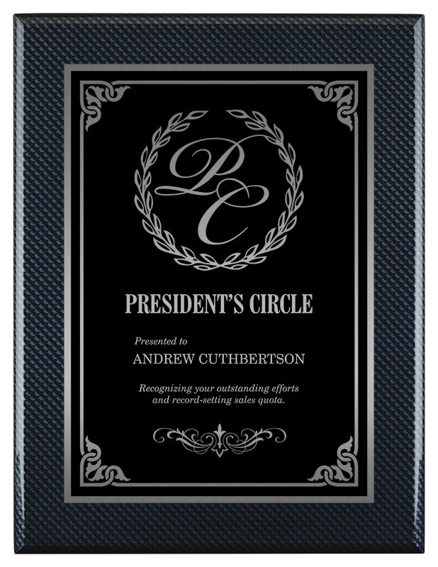 The carbon-fiber look adds a premium, technical edge that stands out on award walls and in executive offices, while the central plate provides an elegant canvas for names, titles, logos, and multi-line citations. If you want a plaque that feels current, confident, and unmistakably “top tier,” this is it.