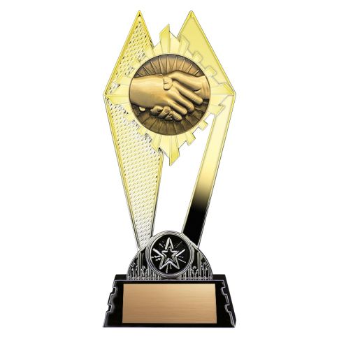 Celebrate professionalism, partnership, and achievement with the Citadel Gold Series Weighted Handshake Trophy, a premium award designed to symbolize trust, leadership, and collaboration. Featuring a detailed handshake emblem framed within an elegant gold geometric design, this trophy represents unity, respect, and shared success—making it ideal for corporate recognition, business awards, employee appreciation, and leadership honors.