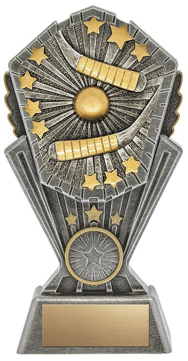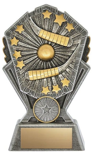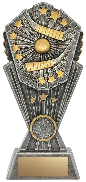 Celebrate the spirit of hockey excellence with the Cosmos Ball Hockey Trophy, the perfect award to honor outstanding performance in ball hockey tournaments and leagues. Crafted with precision and attention to detail, this dynamic trophy features two crossed hockey sticks and a central ball set against a radiant starburst backdrop, symbolizing skill, teamwork, and determination. Accented with golden stars and a sleek silver base, the Cosmos Ball Hockey Trophy adds elegance and excitement to any award ceremony.