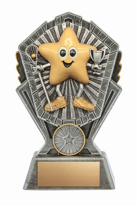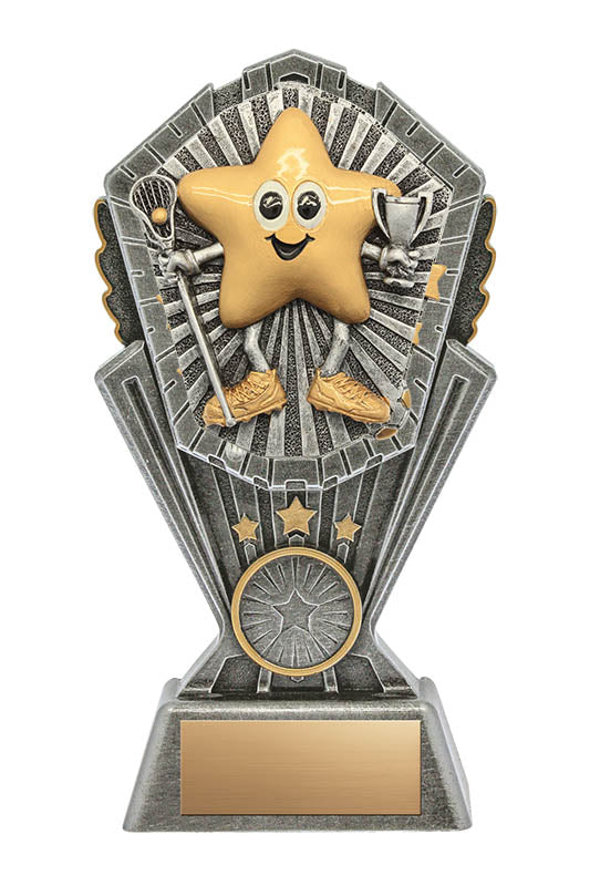 Crafted from durable resin with hand-painted accents, the trophy stands on a silver-tone starburst pedestal with gold detailing and includes a blank nameplate ready for custom engraving. Whether you're recognizing participation, team spirit, or first-time achievements, the Little Star Lacrosse Trophy is a lighthearted and meaningful way to celebrate young players and make them feel like true stars.