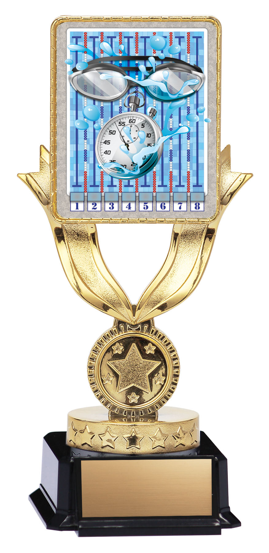 Celebrate swimming achievements in style with the Lynx II Swimming Insert on Holder & Base Trophy. Featuring a striking swimming-themed insert with goggles, stopwatch, and water splash imagery, this award is the perfect way to honor top performers at swim meets, school competitions, and aquatic events. Crafted with a gleaming gold finish and set on a sturdy black base, it combines durability with elegance for a presentation-worthy piece.