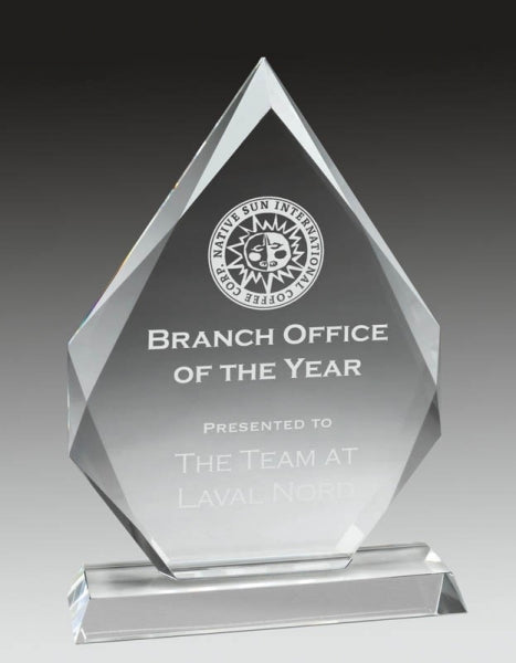 Expertly crafted from premium optical crystal, this award features high-polish clarity and faceted edges that create dazzling refractions of light. A generous engraving area allows for logos, recipient names, award titles, and messages, while the solid crystal pedestal base ensures both balance and a strong display presence.