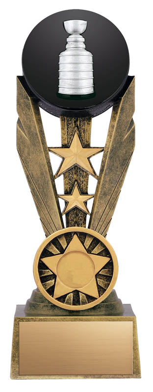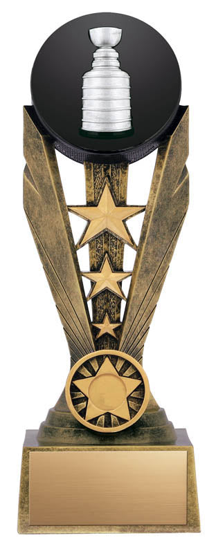 The bronze-and-gold-toned resin body features layered stars and radiant accents that point upward, symbolizing achievement and peak performance. Mounted on a sturdy base with a gold engraving plate, it’s perfect for recognizing MVPs, top scorers, team captains, or exceptional effort at any hockey awards ceremony.
